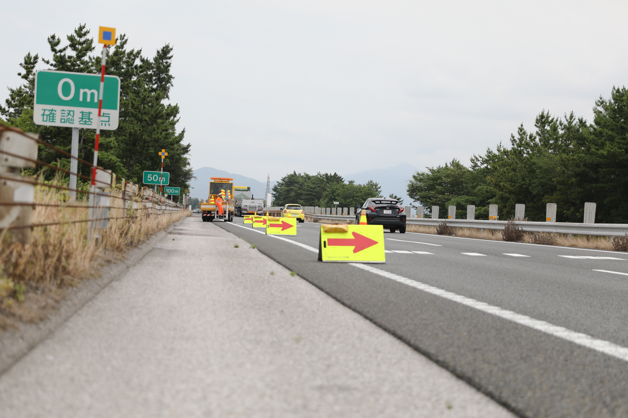 規制に伴う標識設置やテーパーの設置をはじめ、数十キロメートルに及ぶ車線規制(走行・追越)から幅員の少ない路肩規制、局所的な簡易路肩規制まで、すべての規制作業を安全・確実に行います。