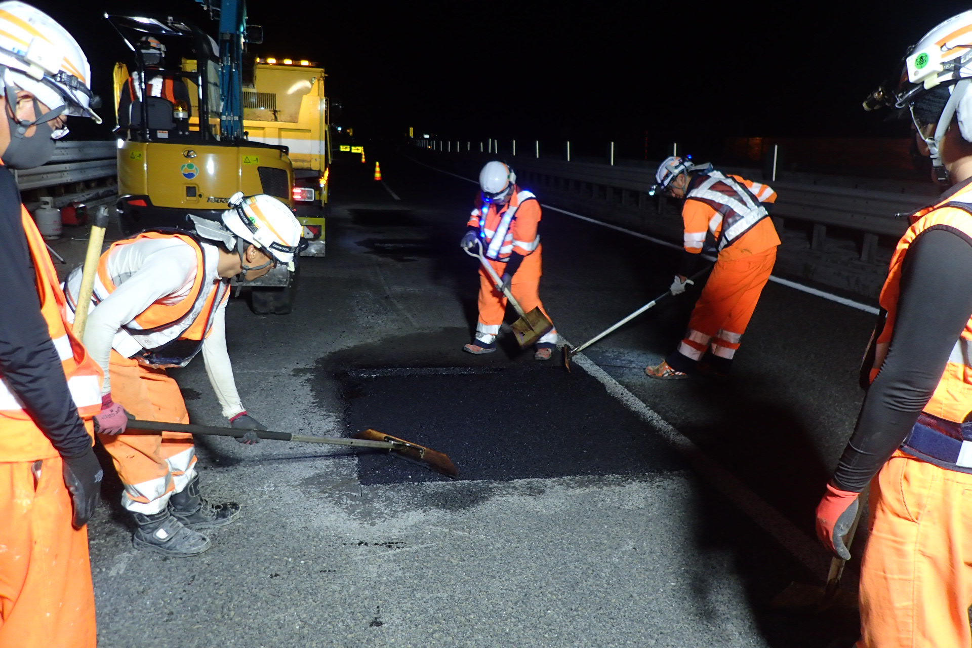 一番は、普段はできない作業を沢山こなすことができる点です。電光掲示板やトンネル内の照明の取り替え、道路の舗装、橋脚にある伸縮装置(橋脚が動くよう、部品のつなぎ目を伸縮させる)の調整といった現場工事は、それぞれの専門業者が集まって担当します。短期集中なので効率が上がるのはもちろん、年間の工事の回数も減るんですよ。