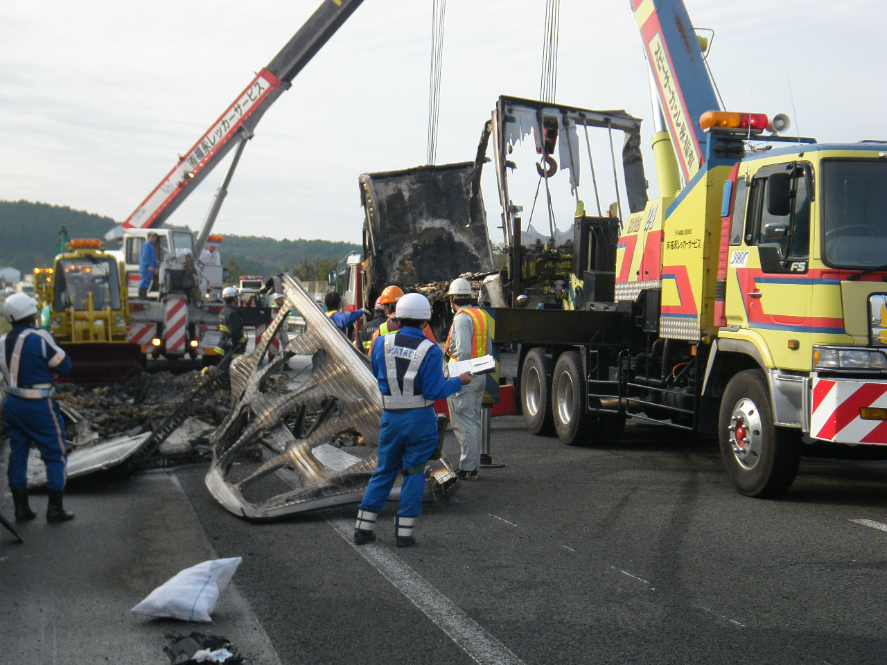 レッカー業者さんが車などを全てどけた後の片づけから始まります。ガラスの破片とか、積荷とかもあるんですよ。NEXCOや警察の方の指示を聞いてから作業に移ります。