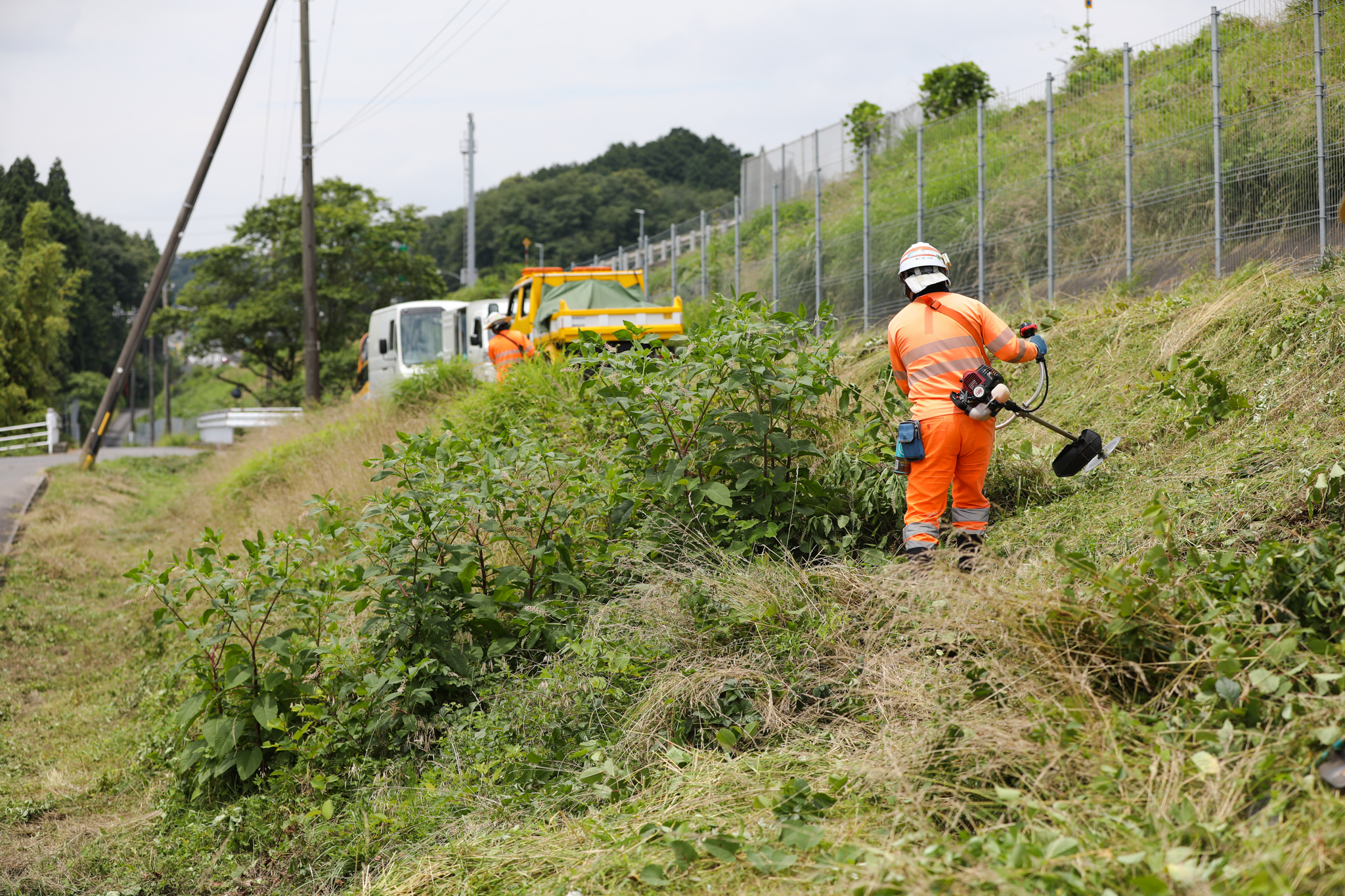 私は、法面(高速道路本線に沿った道の斜面)の草刈りや排水溝の清掃などをしています。排水溝が破損していたら補修もします。草刈り機やスコップ、ブロアという(落ち葉などを)飛ばす機械を用意して現場に行っています。