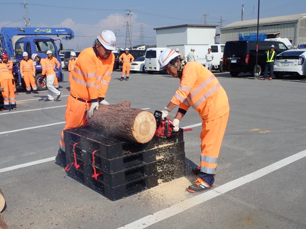 ◇有資格者の指導のもと、普段チェンソーを使い慣れていない人も実際に丸太を切断しながら手順を確認しました。