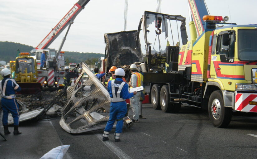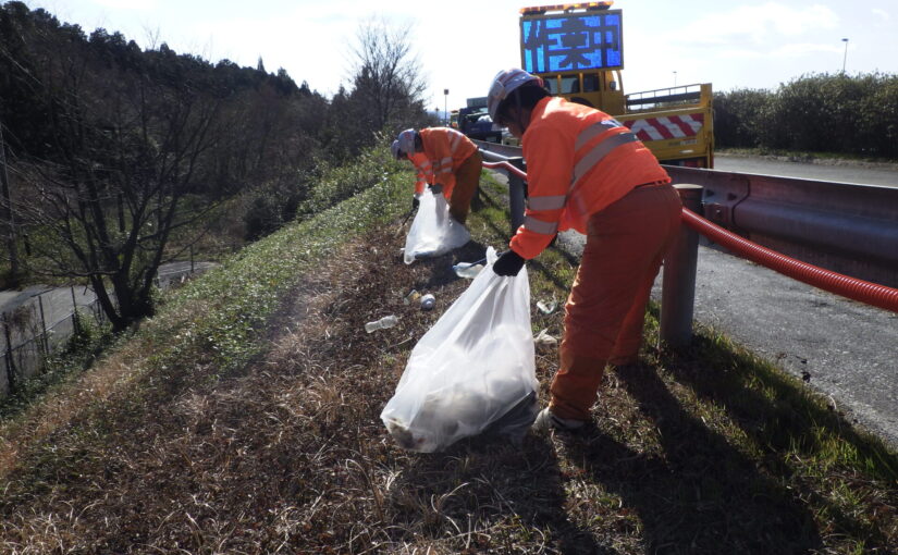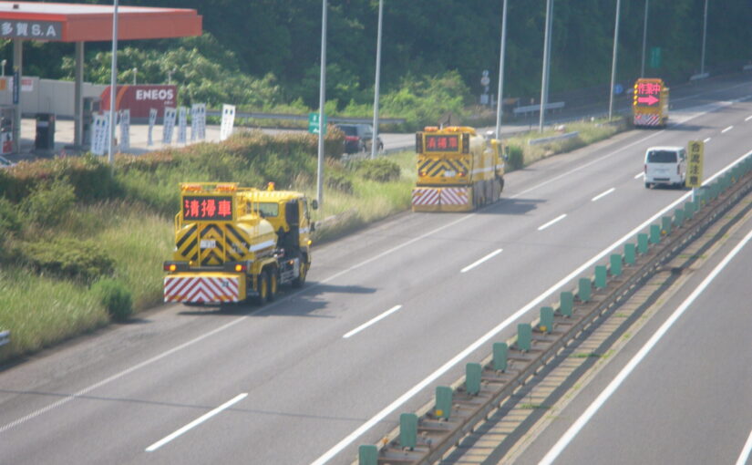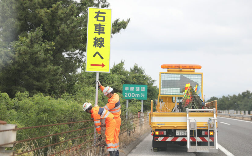 - 道具や車両の準備を行い、作業車で担当エリアの高速道路へ移動します。移動中も安全確認を徹底します。